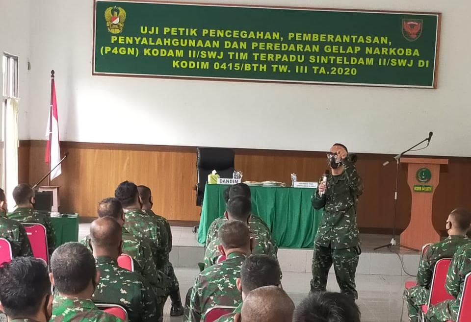 ONLINEJAMBI.COM - Sosialisasi dan Uji Petik Pencegahan, Pemberantasan, Penyalahgunaan, dan Peredaran Gelap Narkoba (P4GN) dilakukan terhadap sekitar 65 personel Kodim 0415/Bth, Selasa (11/8) mulai pukul 09.00 di Aula Sultan Thaha Kodim 0415/BTH Kota Jambi.