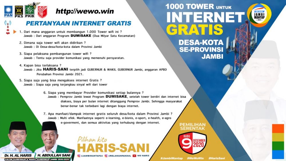 Lewat visi misi Jambi Mantap (Jambi Maju Aman Nyaman Tertib Aman dan Profesional), Al Haris-Abdullah Sani menyiapkan rencana aksi (renaksi) lewat program Jambi Tangguh. Di renaksi inilah nanti program internet gratis di seluruh desa diwujudkan.