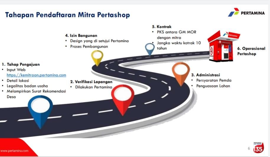 ONLINEJAMBI.COM - Direktur Utama PT Pertamina (Persero) Nicke Widyawati mengatakan untuk tahapan menjadi mitra Pertamina Shop (Pertashop) antara lain pendaftaran dengan menginput di http://kemitraan.pertamina.com, dilanjutkan verifikasi lapangan, administrasi, persyaratan pemerintah daerah dan penguasaan lahan, ijin bangunan berupa desain yang disetujui oleh Pertamina, dan proses pembangunan.