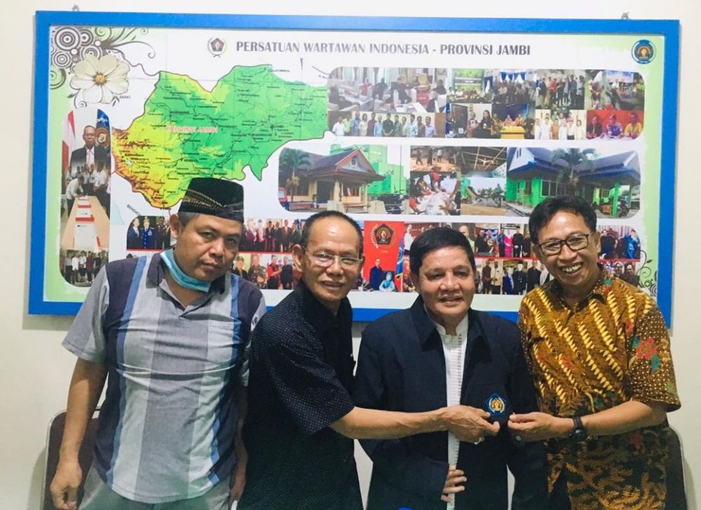 ONLINEJAMBI.COM - Ketua PWI Provinsi Jambi, H Ridwan Agus didampingi Sekretaris Heri Fr memasangkan pin dan jaket PWI kepada H Matlawan Hasibuan, Ketua Penasehat Serikat Meia Siber Indonesia (SMSI) Provinsi Jambi.