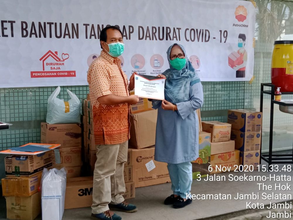 Penyerahan bantuan berlangsung di Kantor PetroChina di Kota Jambi pada Jumat, 6 November 2020. Dalam kesempatan ini, SKK Migas-PetroChina Jabung menyerahkan bantuan paket Covid-19 melalui Dinas Kesehatan Kabupaten Tanjungjabung Barat yang mencakup paket APD (coverall, goggle pelindung mata, face shield, baju apron petugas laboratorium, masker N95, masker bedah, handschoon, nurse cup dan sepatu boot), perangkat laboratorium kit pemeriksaan Covid-19, perangkat cuci tangan dan paket pelatihan Covid-19.