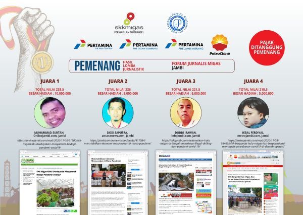 Juara 3 diraih Doddi Irawan dari Infojambi.com dengan total nilai 221,5. Tulisannya berjudul “Selamatkan Hulu Migas di Tengah Maraknya Illegal Drilling dan Pandemi Covid-19.”