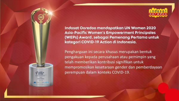 ONLINEJAMBI.COM - Indosat Ooredoo kembali mendapatkan penghargaan internasional bergengsi, UN Women 2020 Asia-Pacific Women’s Empowerment Principles (WEPs) Award, sebagai Pemenang Pertama untuk kategori Covid-19 Action di Indonesia.