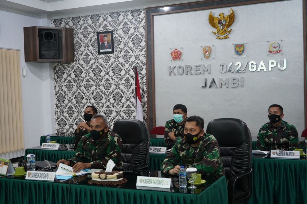 ONLINEJAMBI.COM - Komandan Korem 042/Gapu Brigjen TNI M Zulkifli mengikuti rapat koordinasi (Rakor) Satuan Tugas Penanganan Covid-19 secara virtual, di ruang rapat Makorem 042/Gapu, Kota Jambi. Selasa malam (11/5).
