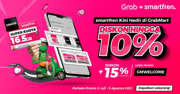 Produk terbaik Smartfren dapat dibeli melalu GrabMart mulai dari Kartu Perdana Unlimited, Gokil Max, Kuota Nonstop, eSIM hingga bundling MiFi. Hingga tanggal 5 Agustus 2021, pembelian produk tertentu akan mendapatkan diskon 10% dan gratis Kartu Perdana Super Kuota 16,5 GB. Bukan hanya itu, ada tambahan diskon 15% dengan menggunakan kode khusus “GMWELCOME”.