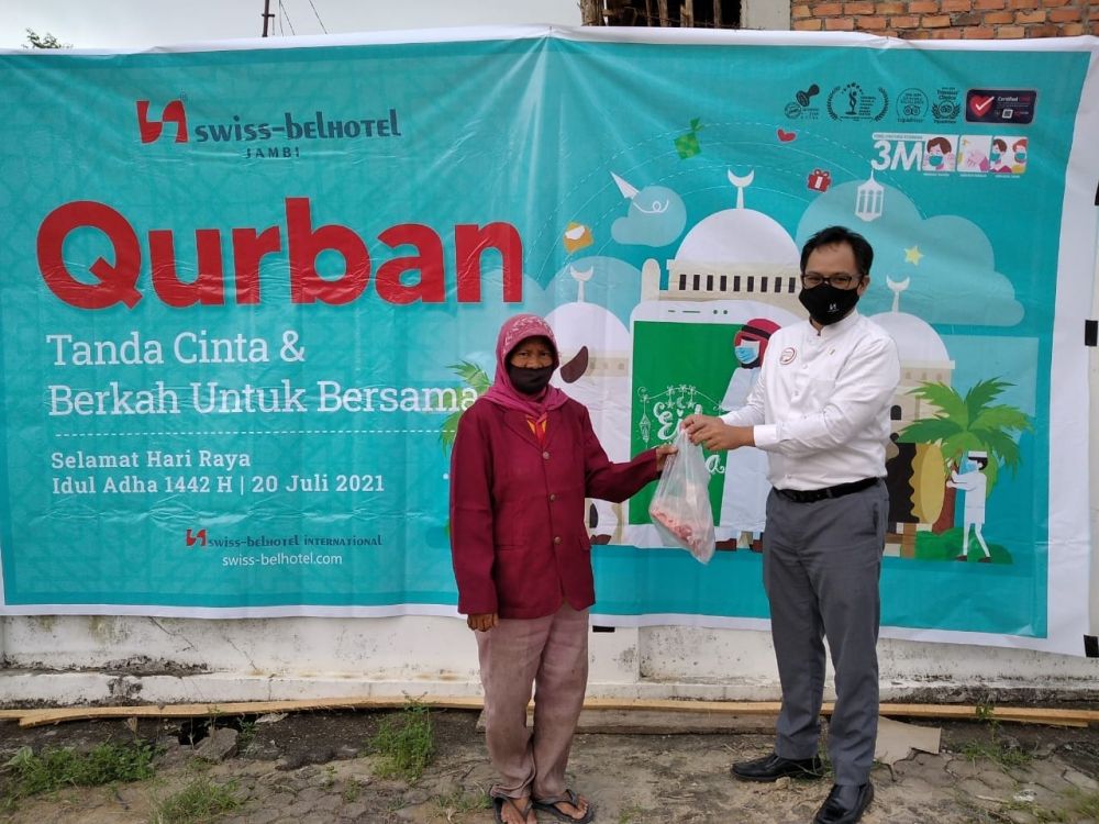 Astri juga menambahkan pelaksanaan Kurban satu ekor sapi dan satu ekor kambing diadakan di area parkir hotel. Sebanyak 120 kg daging dibagikan kepada warga RT 11 Kelurahan Solok Sipin, Masjid Azizi, dan karyawan Swiss-Belhotel Jambi.