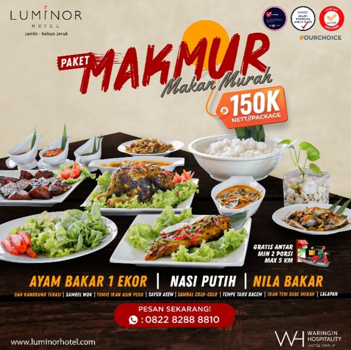 Paket ini tersedia setiap hari, pukul 10.00-21.00 WIB. Tidak hanya itu paket makmur ini bisa dinikmati dirumah. Cara memesannya mudah, anda cukup menghubungi via WhatsApp Hotel Luminor Jambi di 0822 8288 8810 dan pesanan bisa diambil atau di antar kerumah pelanggan.