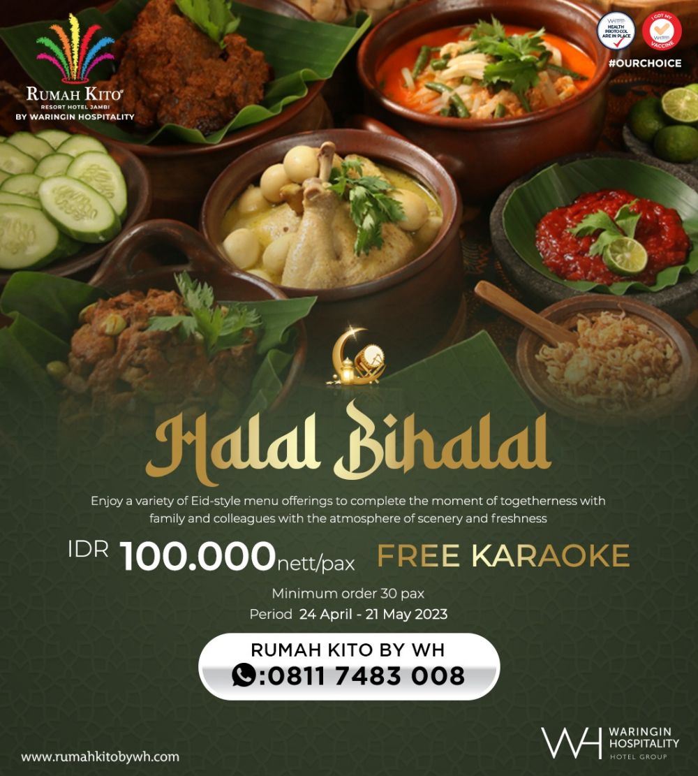 Promo paket halal bihalal di Rumah Kito Resort Hotel Jambi by Waringin Hospitality berlaku 24 April sampai 21 Mei 2023, Tamu juga bisa melakukan pemesanan paket melalui DM Instagram @rumahkitobywh atau bisa lansung WA ke +62 811 7483 008.