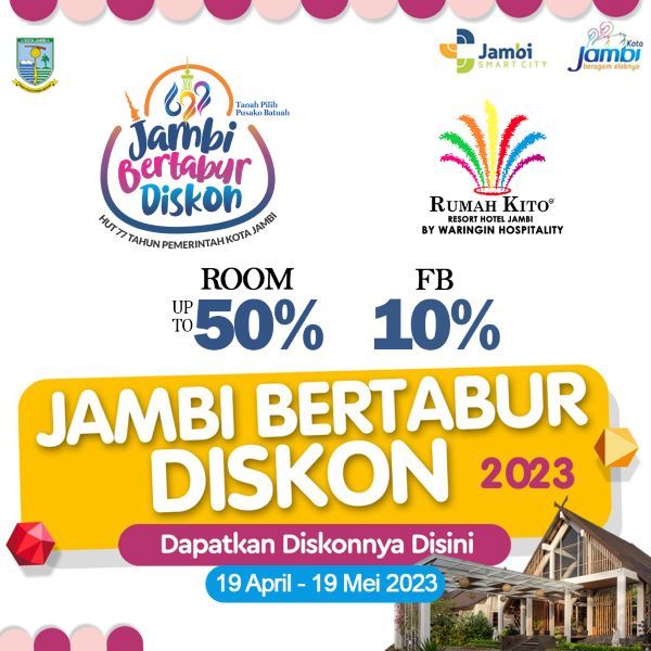 Dalam rangka hari jadi ke-77 tahun Kota Jambi, Rumah Kito Resort Hotel Jambi by Waringin Hospitality memberikan banyak promo spesial HUT Kota Jambi, yakni diskon RoomUp to 50% dan FB 10% berlaku hinggal tanggal 19 Mei 2023.