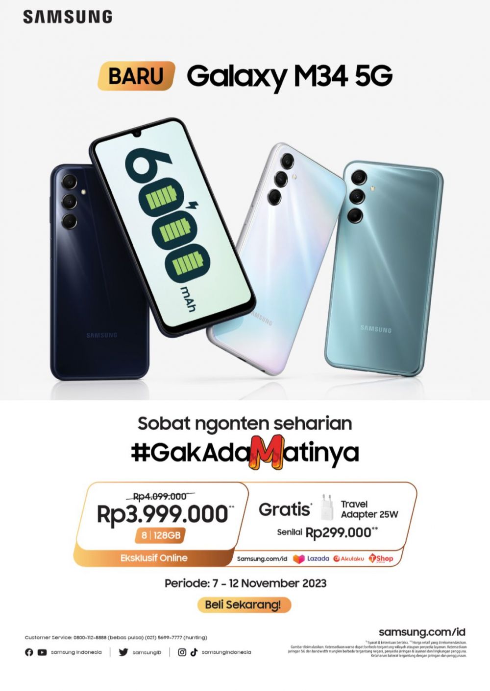 Galaxy M34 5G hadir dengan 3 pilihan warna yang elegan: Midnight Blue, Prism Silver, Dark Blue, dan tersedia pada harga retail yang direkomendasikan Rp 4.099.000. Jangan ketinggalan untuk memesan Galaxy M34 5G dalam periode Flash Sale pada 7-12 November di toko online Samsung.com/id atau Samsung Official Store di Lazada. Pada periode ini, dapatkan harga special Rp3.999.000 ditambah gratis Travel Adapter 25W senilai Rp 299.000(*)