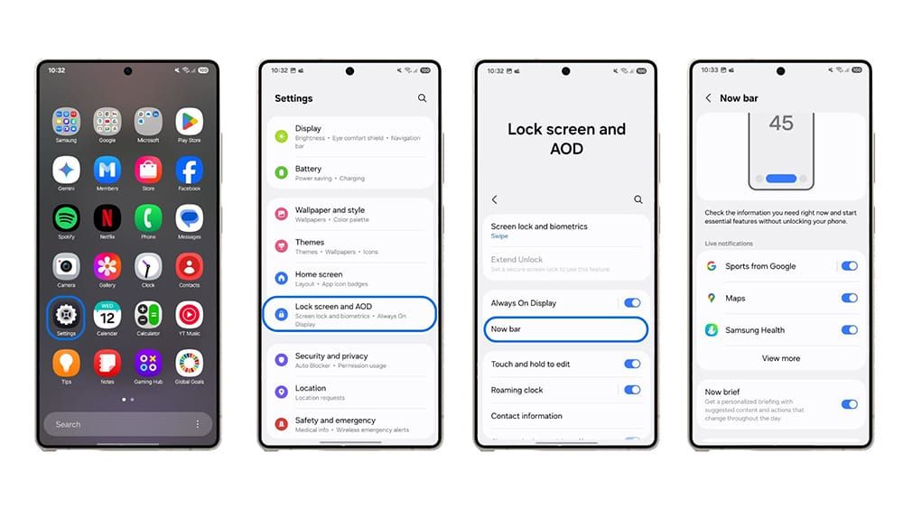 dirancang secara intuitif, Now Bar Ditempatkan di bagian bawah lockscreen agar mudah dijangkau dengan satu tangan. Fitur ini memberikan kenyamanan lebih bagi mereka yang memiliki mobilitas tinggi. Kini Bar juga akan tersedia di seluruh perangkat Samsung dengan One UI 7, menghadirkan pengalaman pengguna yang lebih praktis dan efisien dalam satu ekosistem Galaxy.