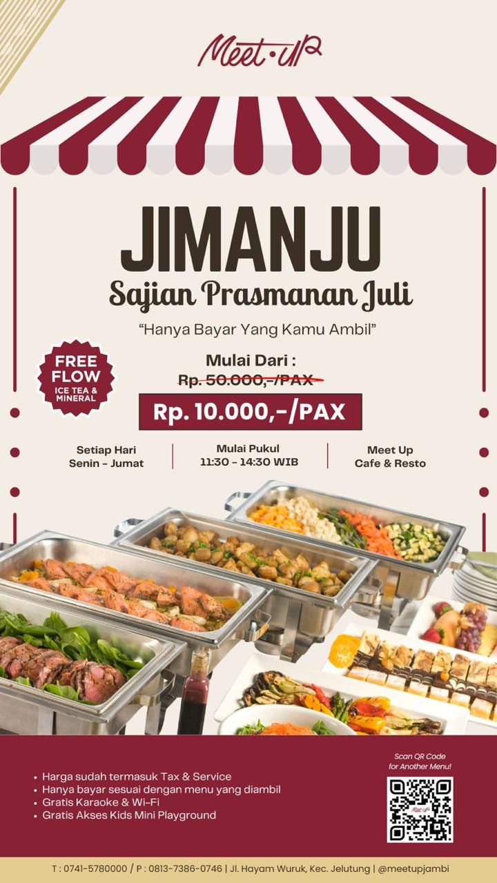 Bertajuk “Jimanju” (Sajian Prasmanan Juli), promo ini menawarkan sajian prasmanan lezat dan menggugah selera yang bisa dinikmati setiap hari Senin hingga Jumat, pukul 11.30--4.30 WIB di Meet Up Cafe & Resto.