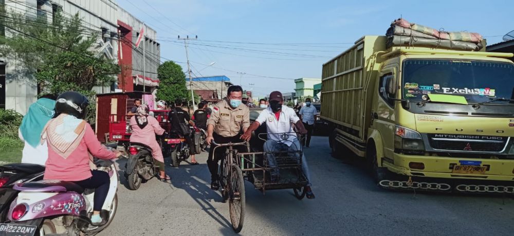 ONLINEJAMBI.COM - Tukang becak di kota Kuala Tungkal, Tanjab Barat sempat tidak yakin dengan tawaran Al Haris yang ingin mengayuh becak.