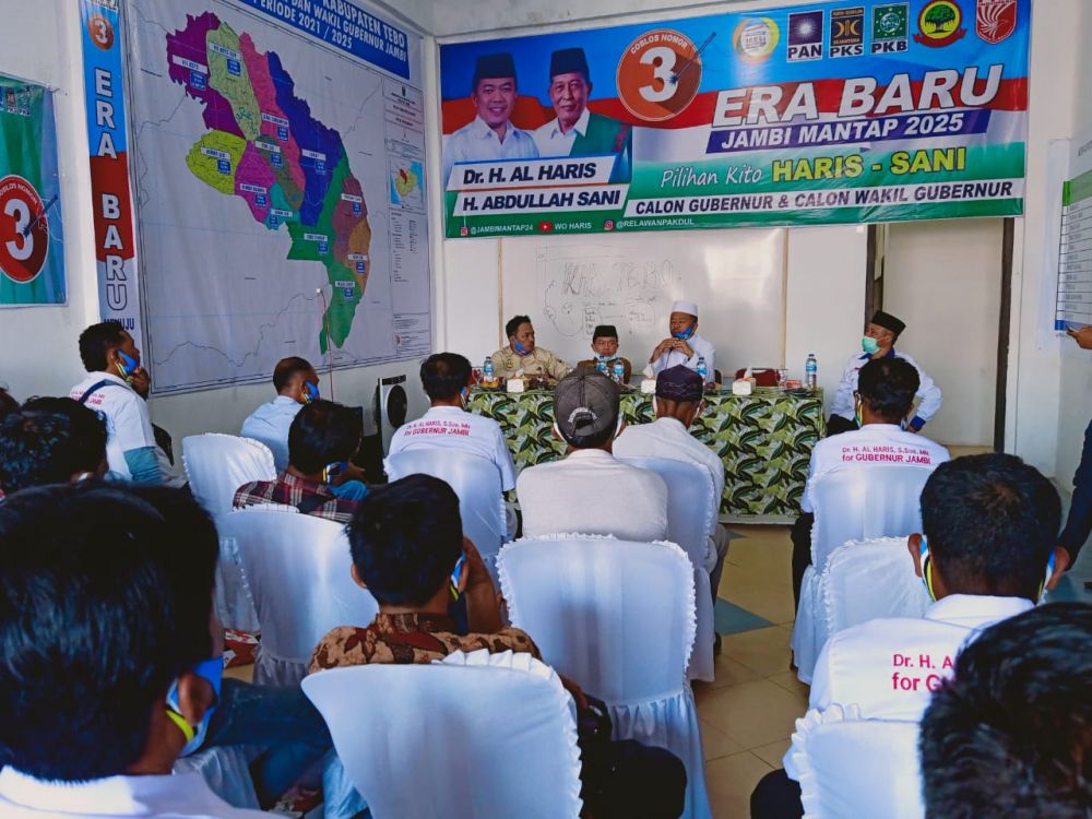ONLINEJAMBI.COM - Al Haris, didampingi Hamdi Korwil Pemenangan Haris-Sani Bungo Tebo, Ketua Tim Pemenangan Haris-Sani Kabupaten Tebo Toha, Jumat (6/11) siang melakukan penguatan tim pemenangan Haris-Sani Dapil I Tebo.