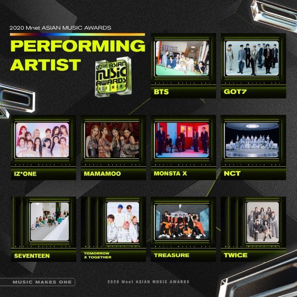 Sederet idol K-Pop, seperti BTS, GOT 7, IZ*ONE, MAMAMOO, MONSTA X, NCT, SEVENTEEN, TOMORROW X TOGETHER, TREASURE, TWICE, dan masih banyak lagi, akan turut meramaikan panggung 2020 MAMA dengan aksi panggung yang sangat megah. Bertema “NEW-TOPIA”, 2020 MAMA akan menghadirkan pengalaman baru menikmati musik di masa adaptasi kebiasaan baru dan menjanjikan selebrasi yang belum pernah ada sebelumnya.