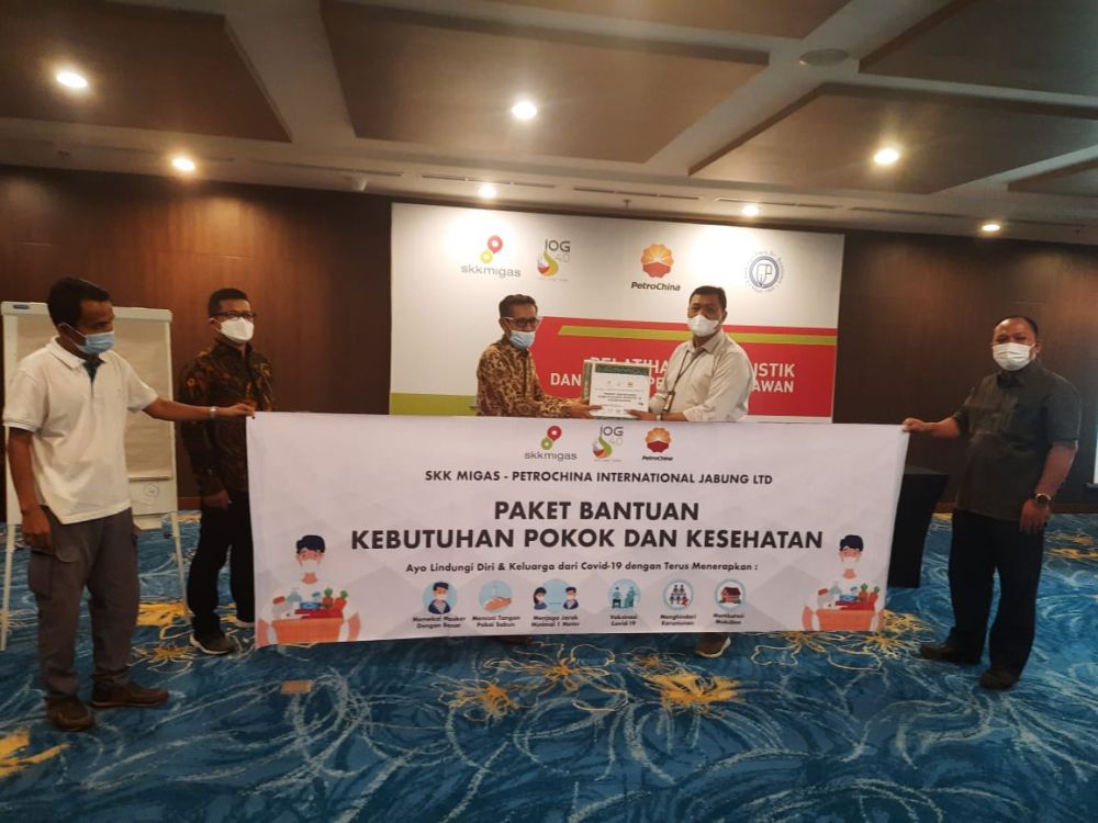 Bantuan yang diberikan sebanyak 60 paket yang penyerahannya diterima Ketua FJM Provinsi Jambi Mursyid Sonsang secara simbolis dari Yulian, Community Development Supervisor (Comdev Supv) PetroChina International Jabung Ltd pada pembukaan Pelatihan Jurnalistik dan Uji Kompetisi Wartawan di Hotel BW Luxury Jambi, Selasa, 14 Desember 2021.
