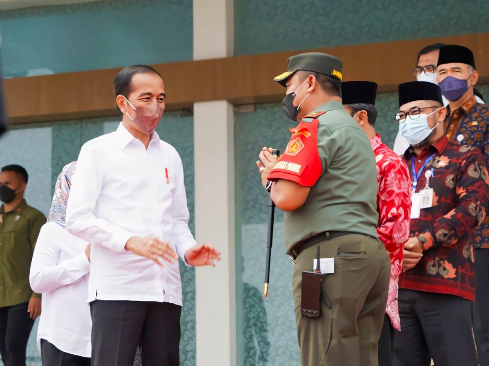 ONLINEJAMBI.COM - Komandan Korem (Danrem) 042/Gapu Brigjen TNI Supriono mendampingi Pangdam II/Sriwijaya Mayjen TNI Agus Suhardi bersama Gubernur dan Kapolda Jambi menyambut kedatangan Presiden Republik Indonesia Joko Widodo (Jokowi) beserta Ibu Negara Iriana Joko Widodo dalam rangka melakukan kunjungan kerja (Kunker) ke Provinsi Jambi.