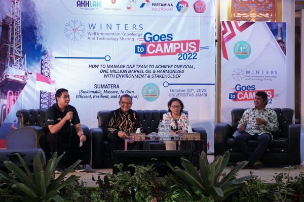 ONLINEJAMBI.COM - PT Pertamina Hulu Rokan (PHR) Regional Sumatra kenalkan industri hulu migas kepada mahasiswai Universitas Jambi (Unja) melalui program WINTERS Goes to Campus 2022 yang mengangkat tema “How to Manage One Team to Achieve One Goal, One Million Barrel Oil & Harmonized with Environment & Stakeholder”. Kegiatan berupa kuliah umum ini diadakan di Aula Rektorat Lt. 3 Unja Mendalo, Kabupaten Muaro Jambi, Provinsi Jambi, Kamis (20/10/2022).