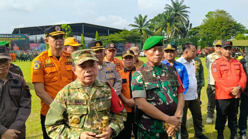 ONLINEJAMBI.COM - Gubernur Jambi Al Haris memimpin apel siaga darurat bencana kebakaran hutan dan lahan (Karhutla) di lapangan Korem 042/Garuda Putih Jambi, Kamis (19/6/2025).