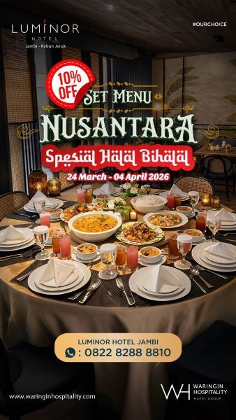 ONLINEJAMBI.COM - Dalam rangka menyambut momen kebersamaan Hari Raya Idul Fitri, Luminor Hotel Jambi menghadirkan promo spesial bertajuk “Set Menu Nusantara Spesial Halal Bihalal” yang berlangsung tanggal 24 Maret hingga 4 April 2026.